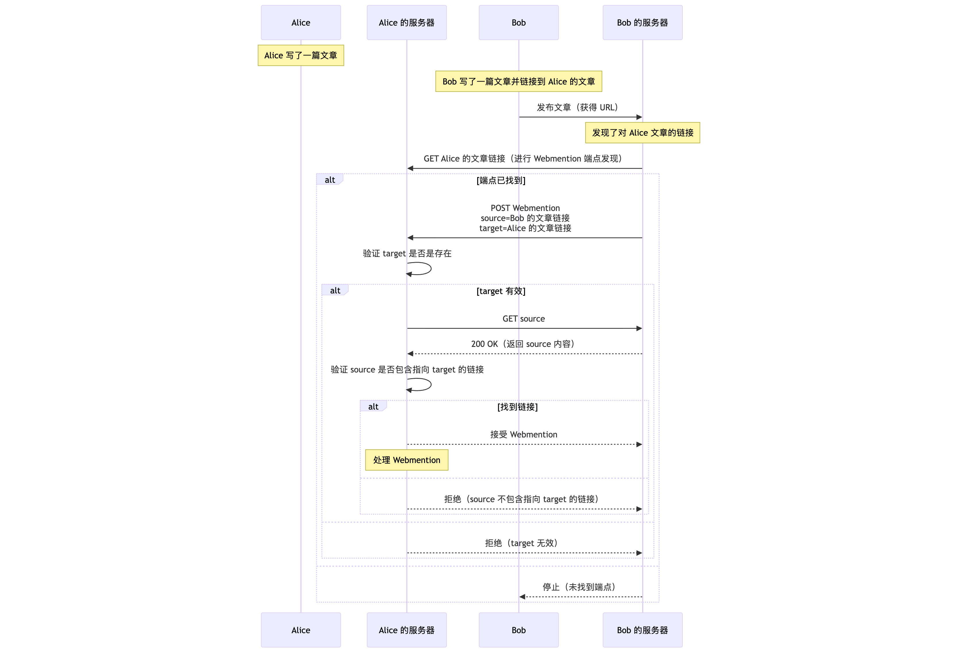 例如,Alice 在她的博客上写了一篇有趣的帖子。随后 Bob 在自己的网站上写了一篇回复她的帖子,并链接回 Alice 的原始帖子。 Bob 的发布软件向 Alice 发送一个 Webmention,通知她的文章被回复了, Alice 的软件可以将该回复显示为原始帖子上的评论。