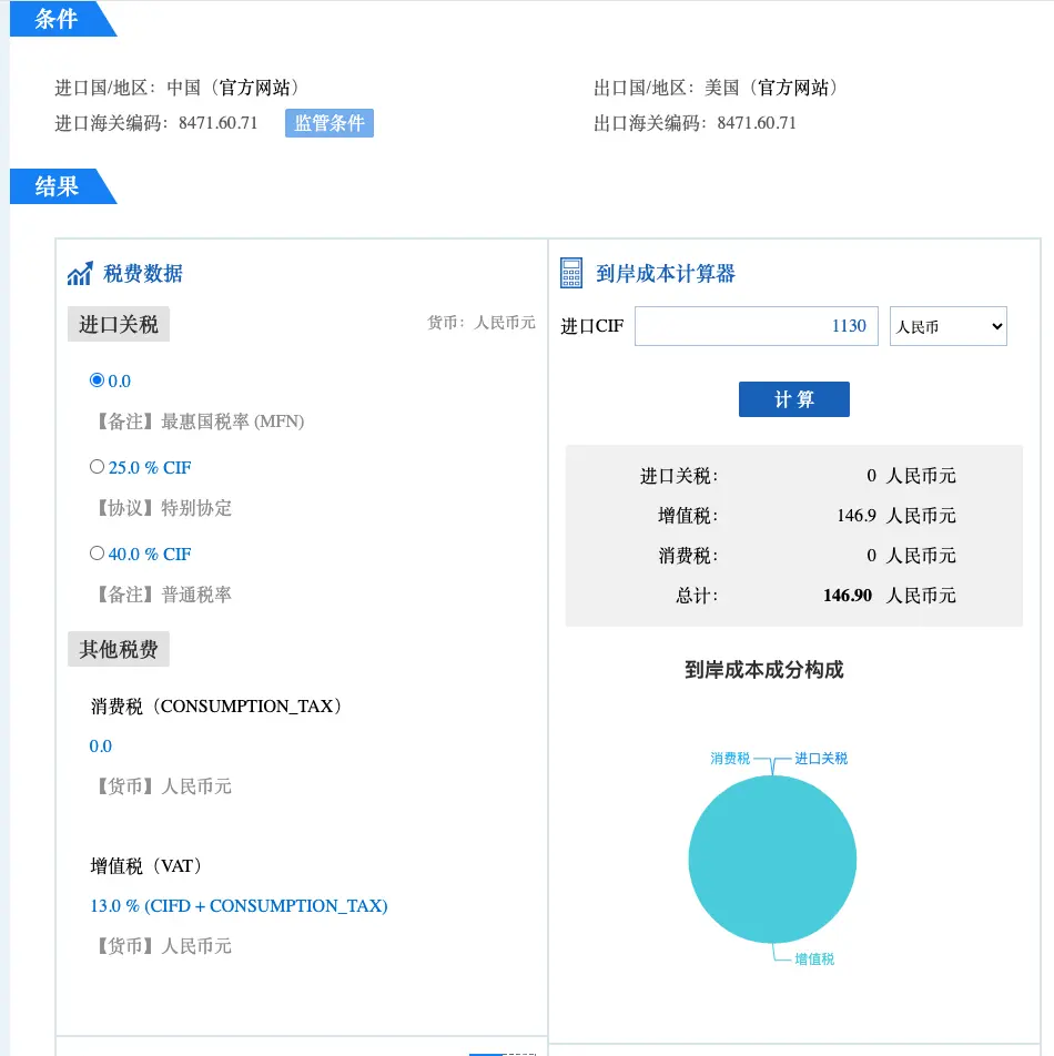 可以用 外贸实务查询服务 大致查询,先要找到商品的海关编码,然后基于海关编码查询。