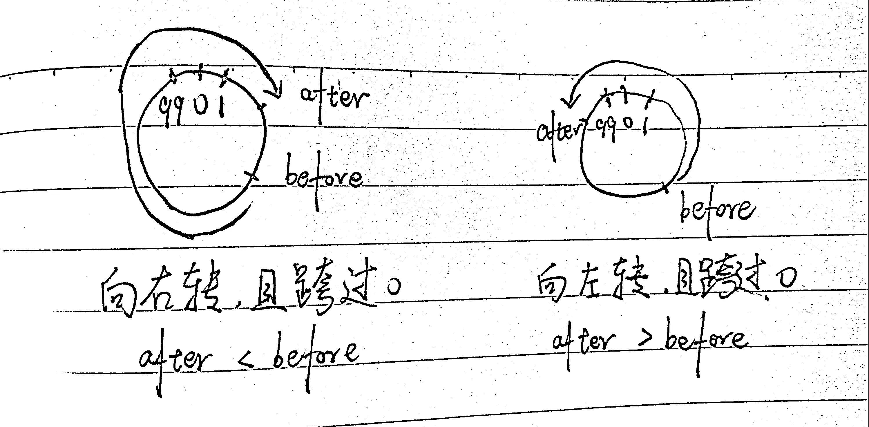 如果是向右转动,且转动后跨过刻度 0,那么 after 一定是小于 before 的。