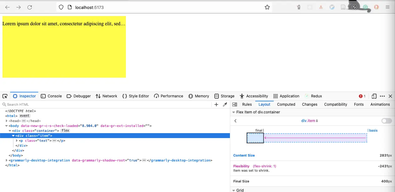有一个 flex box,宽度是 400px,里面有一个 item,item 中有一段很长的文字,文字不换行。