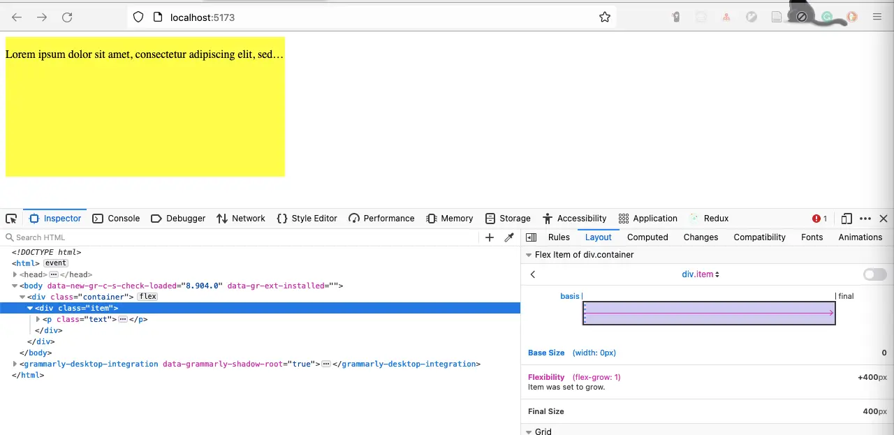 不过此时由于 flex item 默认 flex-grow: 0, 不会延展尺寸,因此还要设置 flex-grow: 1, 让 flex item 去延展填满剩余空间。