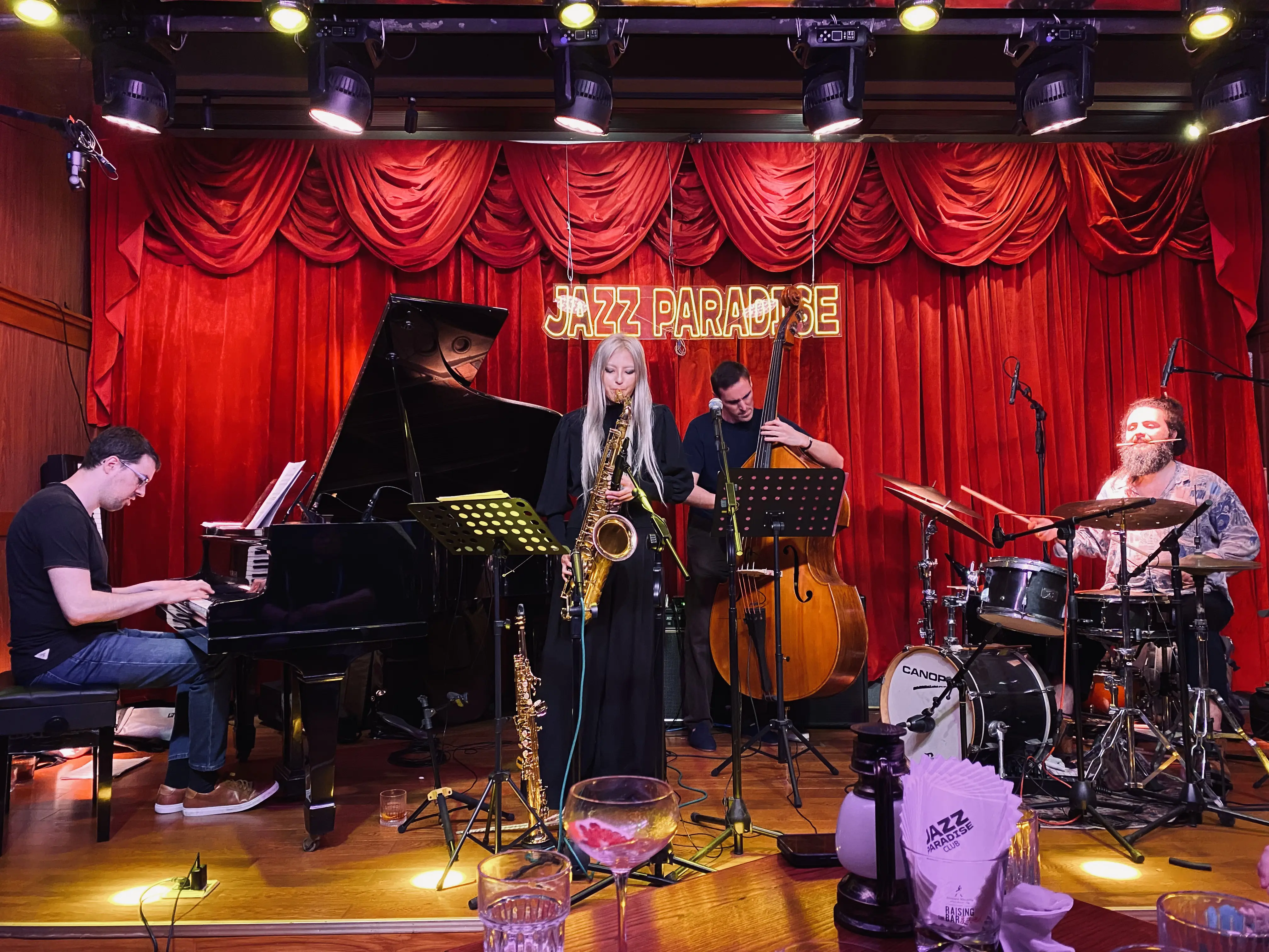 深圳的演出在 Jazz Paradise,在海上世界附近的一个餐吧。我提前打电话预约了位置,服务员告知我吧台位置挺多的,直接去就好。他可能是不知道晚上有陶玙的演出,人会比较多,我也信以为真,就没有预定位置。结果去到 Jazz Paradise,里面已经坐满了人,门口也还有不少人在等位置,感觉被那个服务员坑了,但也无可奈何,只能排队等等看。以后不管如何还是定个位置,就不用面对这样的意外情况。幸运的是,一段时间后腾出了一个位置,和其他几个人拼了张桌,还是在舞台的前面!Lucky!