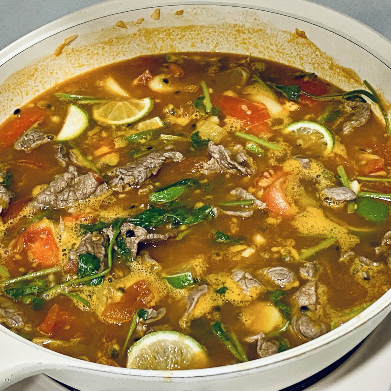 - 加入牛肉煮熟,再把番茄块、柠檬片、香菜碎丢进去,咕噜一下,搅拌一下即可
