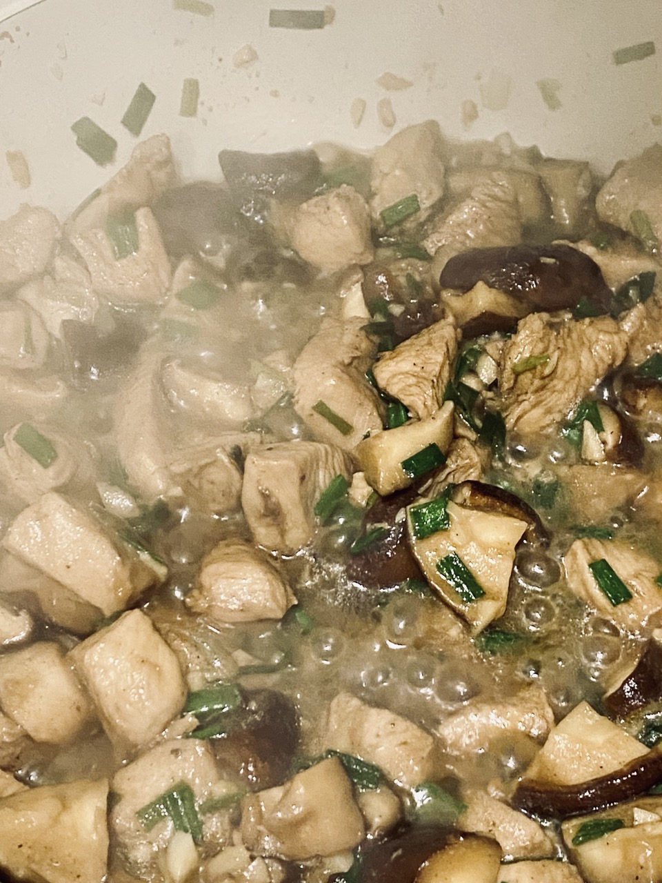 - 热油炒香蒜末,加入香菇炒到变软,再加入鸡肉混合翻炒,如果鸡块比较大,怕不熟,就盖上锅盖焖煮一下