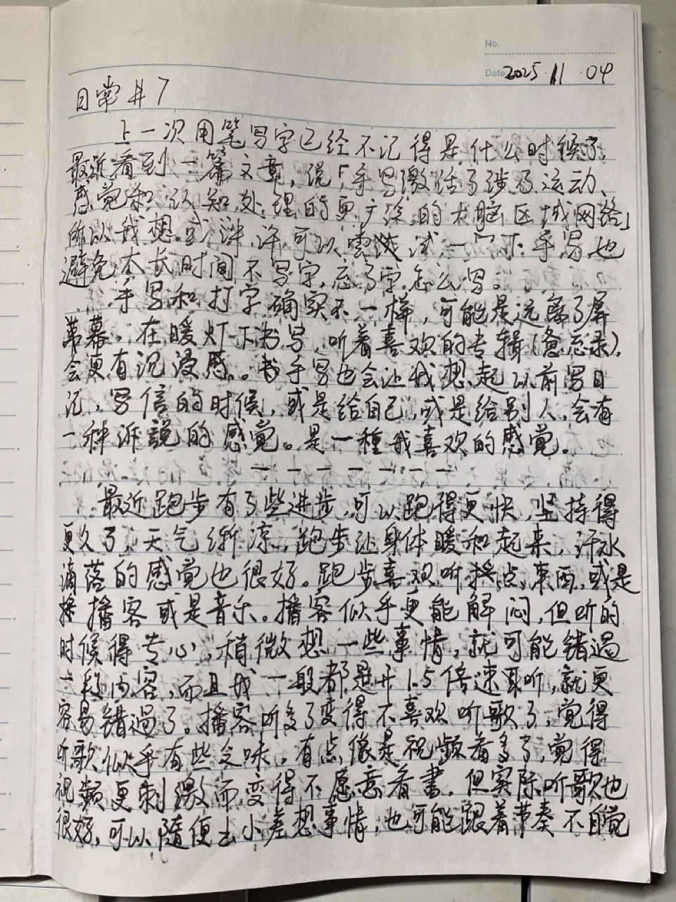 上一次用笔写字已经不记得是什么时候了,最近看到一篇文章,说 「手写激活了涉及运动、感觉和认知处理的更广泛的大脑区域网络」。所以我想或许可以尝试一下手写,也避免太长时间不写字,忘了字怎么写。手写和打字确实不一样,可能是远离了屏幕,在暖灯下书写,听着喜欢的专辑(惫忘录),会更有沉浸感。书手写也会让我想起以前写日记,写信的时候,或是给自己,或是给别人,会有一种诉說的感觉,是一種我喜欢的感觉。