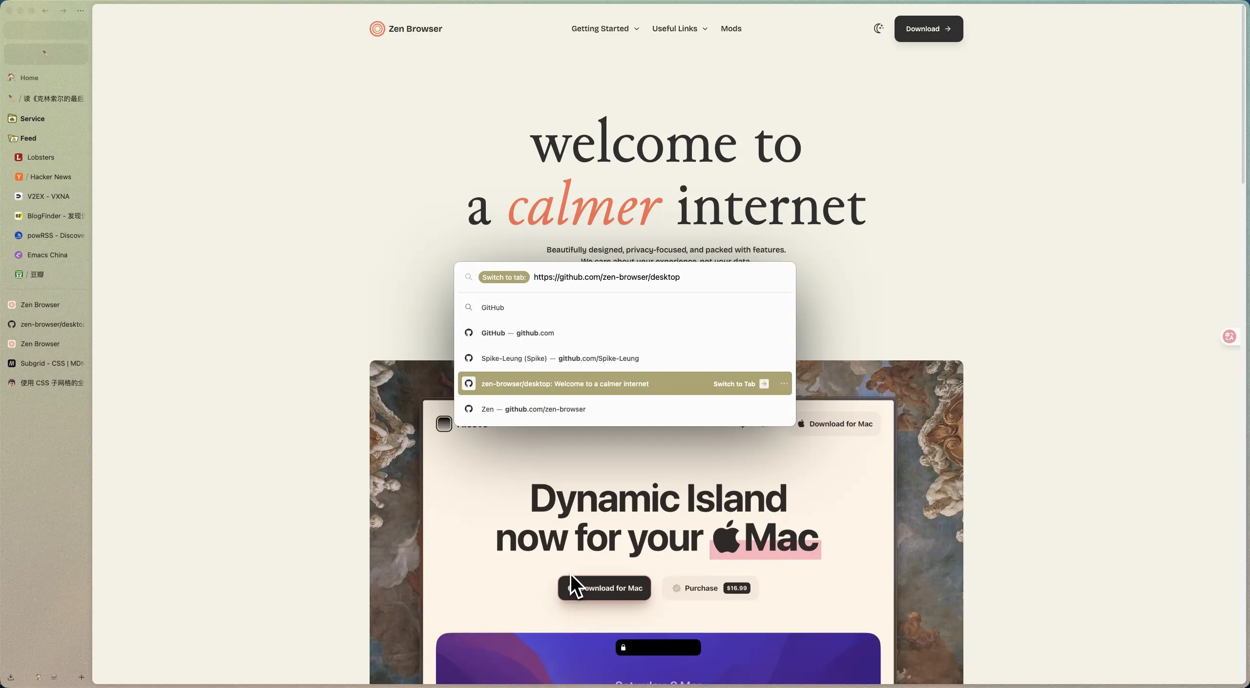 Zen 将 tab 放在了侧边栏(可以通过快捷键快速收起展开),应用的上下留白很少,使得网页能够占据足够多的空间,页面浏览起来会更沉浸一些。不过上下留白少也有一个缺点,当我需要拖动窗口时,不容易选中可拖拽的部分。